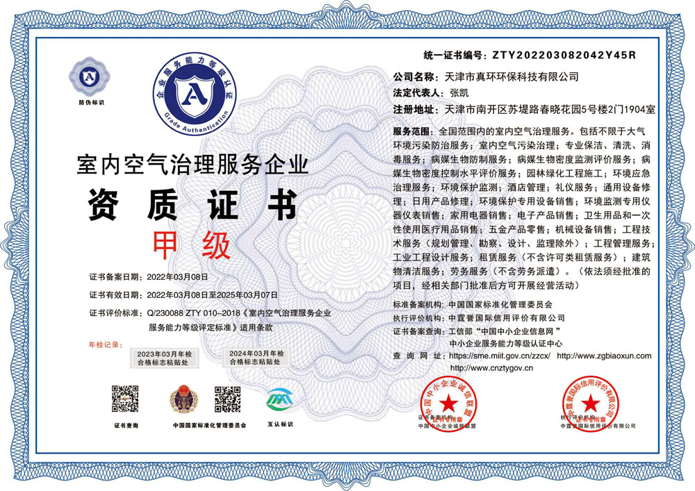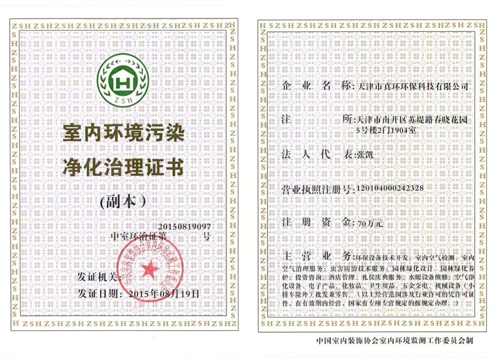 室內環境污染凈化治理證書